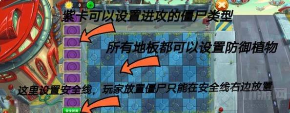 5、 疯狂博士:这个玩法就没什么新意了,和对战模式里面的花园战争玩法差不多。总体模式还是一样的,都是选择僵尸进攻植物。首先紫卡栏可以设置进攻的僵尸类型;所有地板都是可以种植植物的,种满都可以;最后还有一个安全线,设置安全线后,放置僵尸只能在安全线最右边放置。