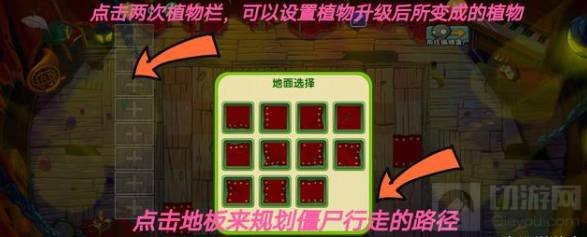 6、剧院惊魂:这个玩法和保卫萝卜有点相似,这个玩法的最终目的是保护戴夫的小木屋。一个塔防关卡,点击地板可以设置僵尸的行走路径,想往哪里走还是玩家说了算,这一个特点给了玩家很大的开放性;然后是设置植物栏,主要告诉大家如何让植物升级,先选择任意一颗植物放入植物栏,然后再点击植物就会出现设置,可以任意设置升级后的形态(比如开始是豌豆,升级后变成西瓜,这也是可行的)。僵尸行走路径,只需要对齐地面选择周围的星星,并且和起点和终点连接起来就没问题了。
