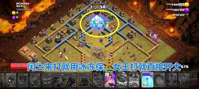 剩下的时间就是丢丢冰冻法术坐等三星了,有的小伙伴可能会问,小白为什么没有提到“地震法术”怎么用呢?因为在小白实验这个打法的时候,没有一次把“地震法术”同时运用到一个地方,所以“地震法术”就看情况释放,在“滚木车”被摧毁以后,只要大部队遇到城墙了就可以使用“地震法术”大致的方位就在阵型的中间,因为到达敌方大本营的区域有左右两条通道,不用担心大部队会受到阻挡,所以在中间区域释放“地震法术”最划算,当然也要看情况来调整“地震法术”的位置。