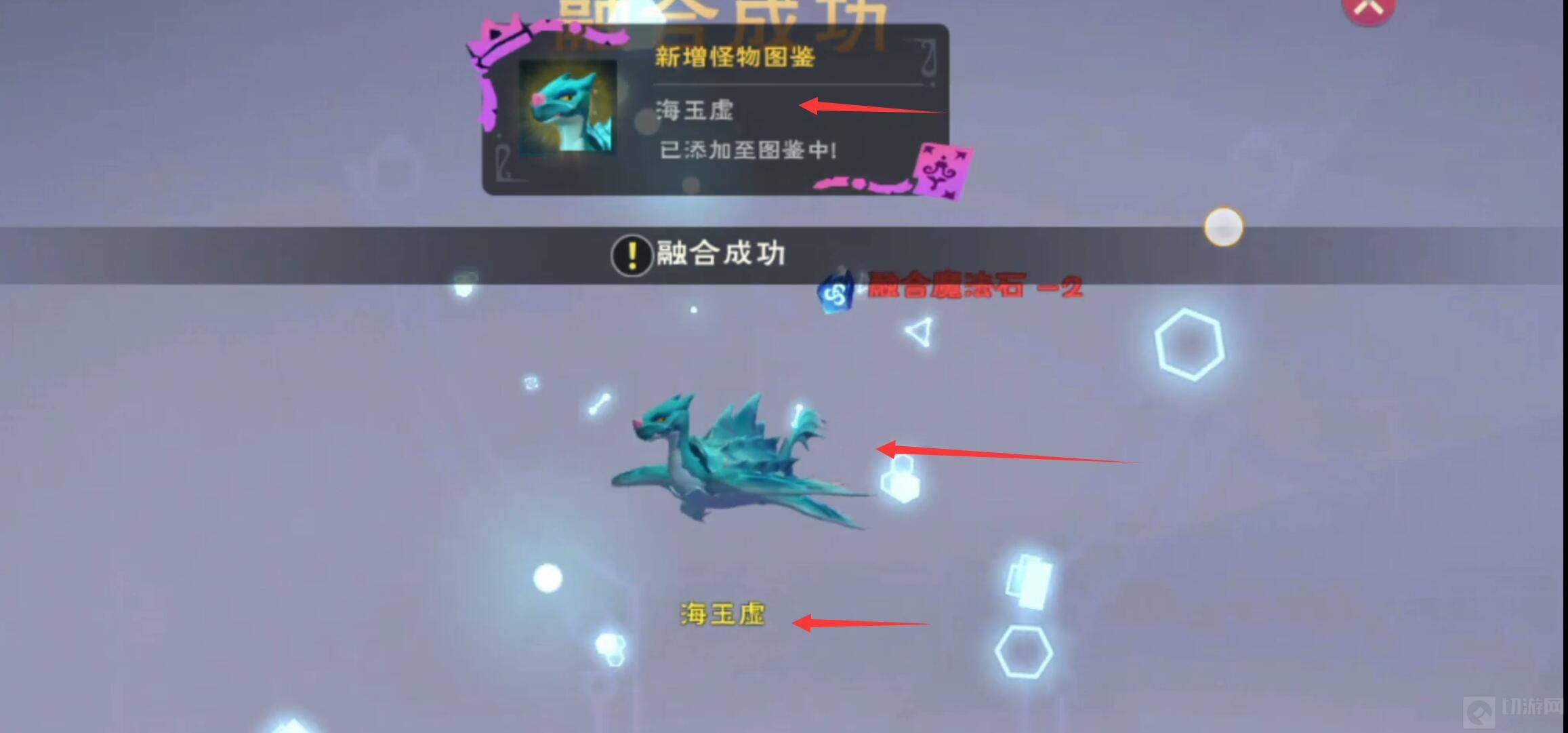2、选择融合之后点击确认融合,会融合出来一个新的怪物战宠,海玉虚,这个战宠只能使用2只鳞甲海龟才可以合成,鳞甲海龟的作用就是可以合成融合战宠海玉虚。