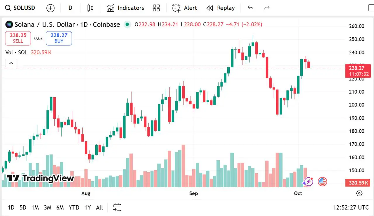 Solana 目前的股价为 228.25 美元,过去一天下跌了 1.02%。其市值为 1247.5 亿美元,交易量为 82 亿美元,较上一交易日下跌了 10.17%。这些数据表明 Solana 是表现最佳的区块链网络之一,其特点是高流动性