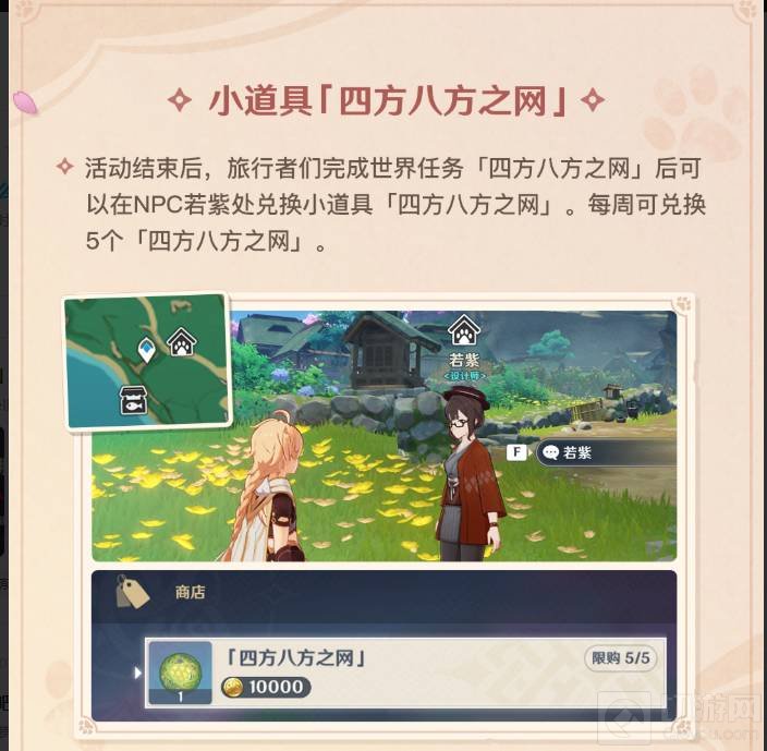 2、完成该任务后,前往下图位置,寻找NPC若紫,即可购买获得「四方八方之网」道具,使用这个的道具可以在大世界中收集小动物并且在尘歌壶内化形。