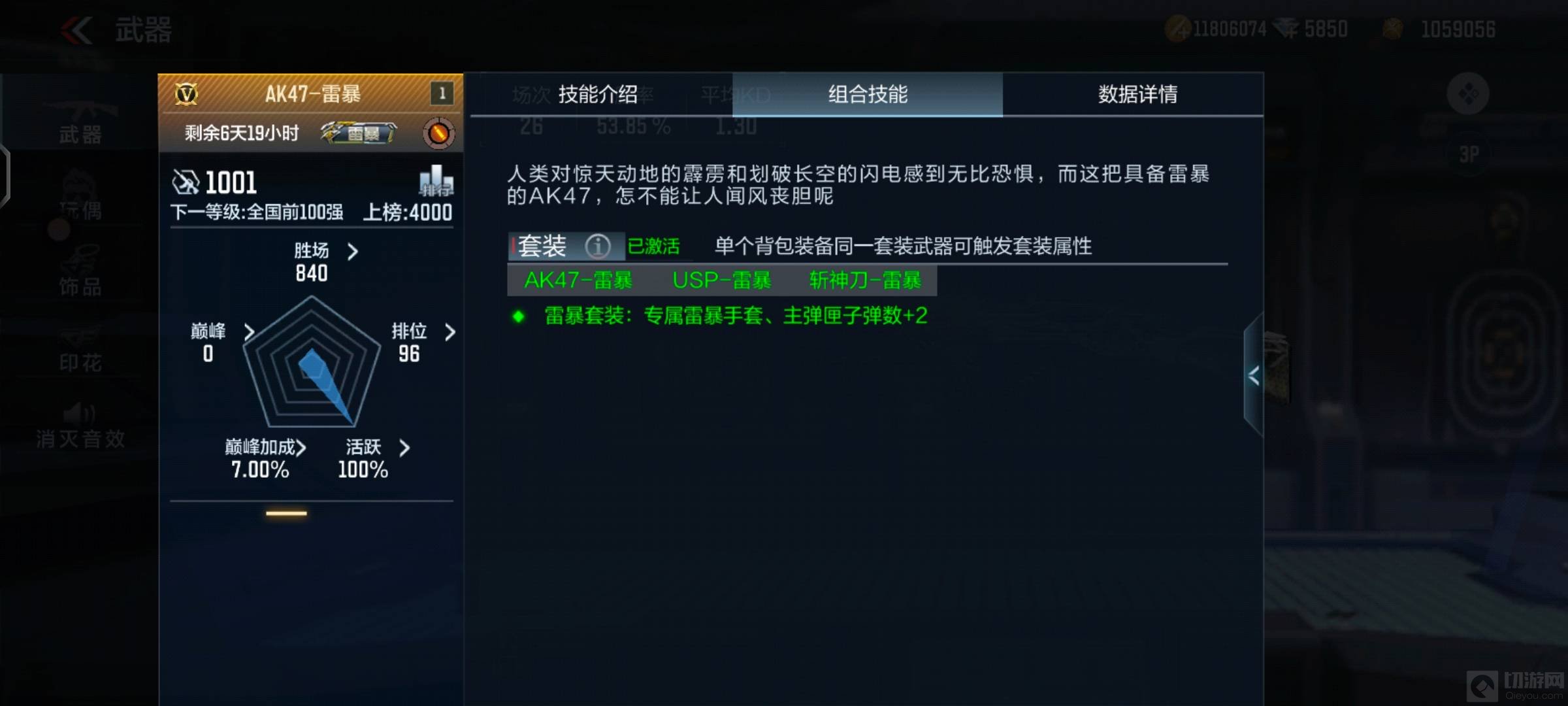 雷暴套装装备之后拥有专属的雷暴手套,并且主弹夹子弹加2,此外雷暴主武器也有额外的生化伤害加成。