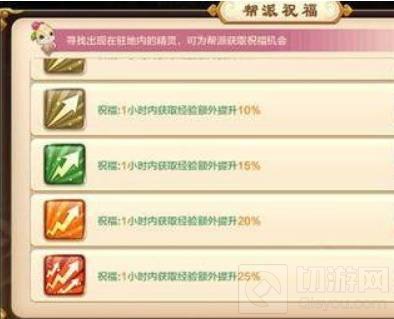 1、驻地精灵加成:每星期二周六18.00~18.30,帮派驻地会呈现240只精灵,隐蔽在驻地每个角落里,只需二百只就能获取1小时25%经验加成,可随时启动。