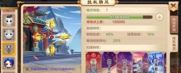 3、在线挂机精灵加成:出战在线挂机精灵六道藏,全部经验获得加成10%,(70级前加成20%),神兵六道降魔杵声望值满后激活获取六道藏。
