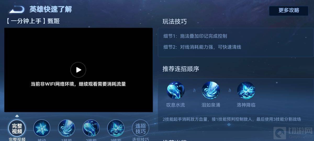 5、甄姬的连招建议是二技能起手消耗敌方血量,接一技能预判控制敌人,最后使用三技能分割战场,增加甄姬的存活率,甄姬的技能可以边走边放,适合拉扯对战。