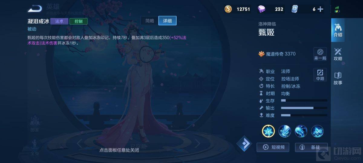 4、甄姬的被动可以冰冻敌人形成控制效果,在有两个敌方单位时可以起手一技能控制,再二技能弹射叠满印记造成伤害。
