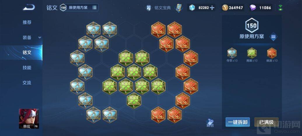 了解完技能后,可以给韩信搭配一套适合的铭文,韩信是高机动性的物理攻击打野,因此携带十个夺萃增加吸血,十个鹰眼增加物理穿透,十个祸源提高暴击率。