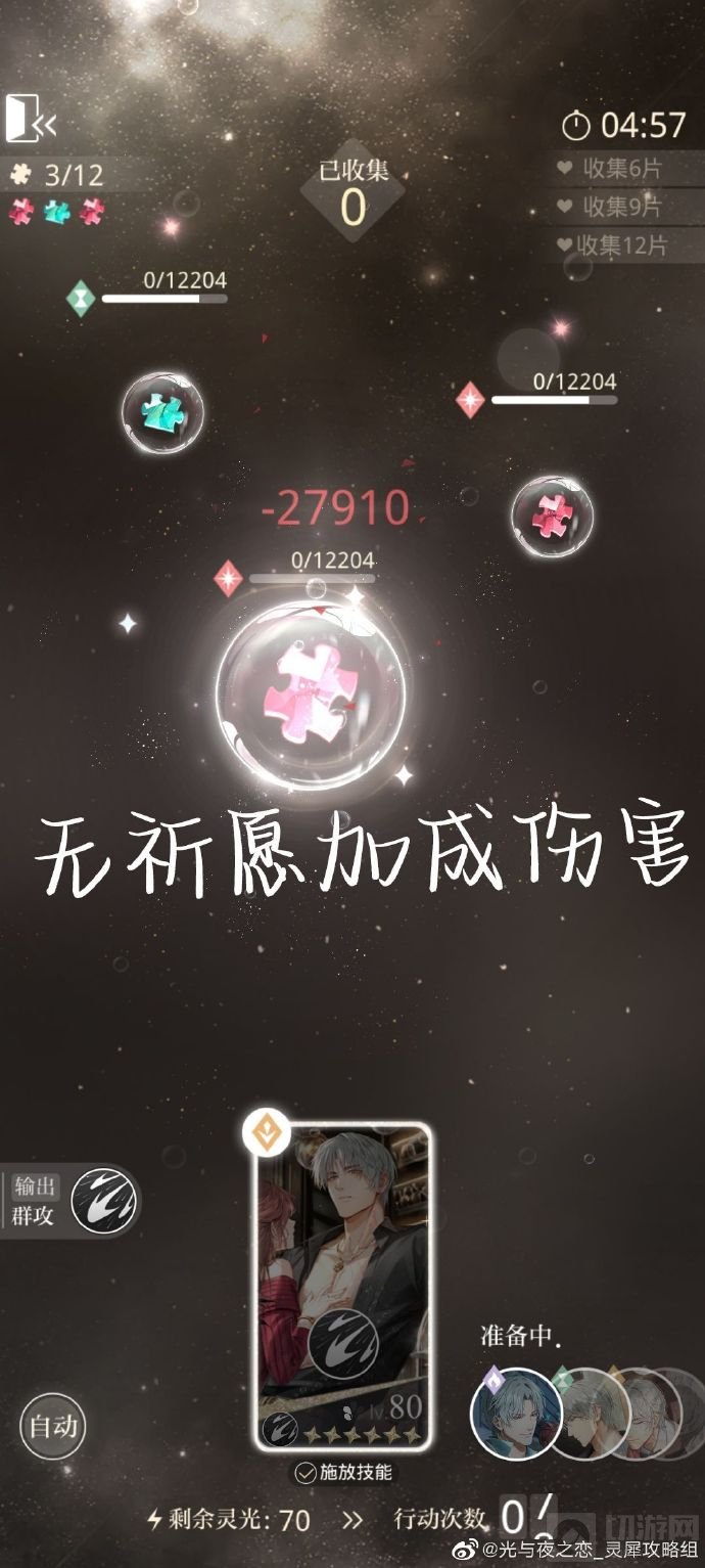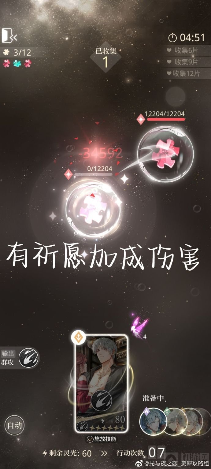 2、[分析]:增益就是同男主上阵卡面伤害提升,效果出现在第一轮和第三轮。对于查理苏卡多开花多的很有用,建议上阵时放在同男主第一位,利益最大化。