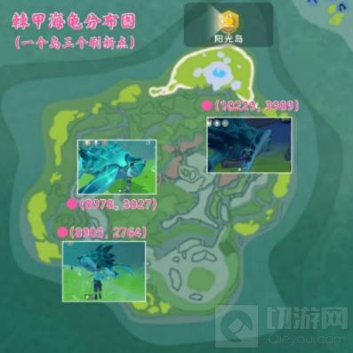 1、首先是棘甲海龟,棘甲海龟是沉眠之海的精英级怪物,45级可抓捕,主要分布在沉眠之海以下三个刷新点。