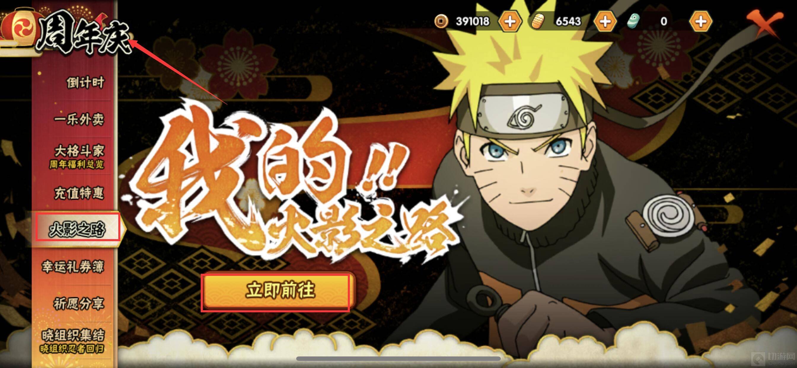 1、首先在游戏的主页面进入到周年庆活动栏中,在活动栏找到‘’火影之路‘’活动并点击立即前往。