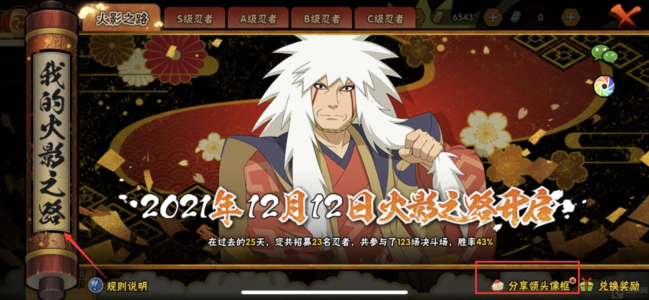 2、前往之后会挑战到火影之路页面,点击右下方的‘’分享领头像框‘’图标选项。