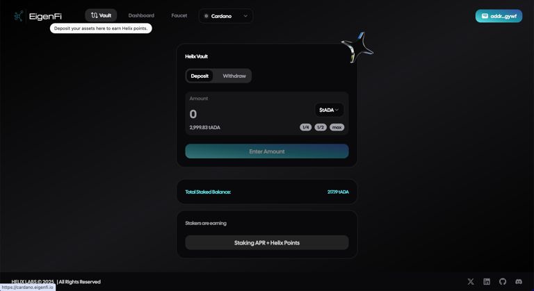 Helix Labs 是一家致力于挖掘跨链质押资产最大价值的去中心化金融创新实验室。其核心产品 EigenFi 提供安全的多链流动性金库,支持发行“流动再质押代币”(LRT),让用户不仅能持续获得原链的质押收益,还能参与各种 DeFi 活动。借助 ICP 的 Chain Key 等前沿技术,Helix Labs 实现了无需信任的跨链交互,解决了流动性碎片化的问题,构建了一个统一、高效、资本利用率极高的跨链质押和去中心化金融基础设施。