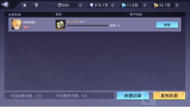 3、同时呢,也可以认识很多的大佬,在打一些活动时,有大佬带队往往都是事半功倍。还有一个功能叫做公会祈愿,发布祈愿选择你所需要的猎人的碎片,如果公会里有人有,就会回应你的求助。但如果你要的是那种史诗级猎人的碎片,有的时候就要等大佬投喂或者是自己小号给了。