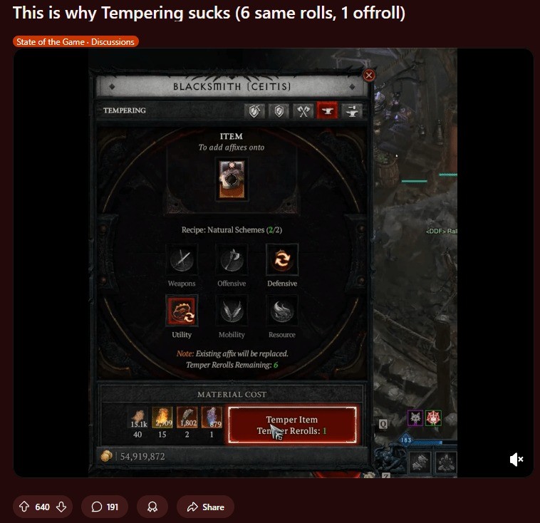 许多人抱怨运气不佳,还有人不满重置次数限制及强制使用卷轴的设计。总体而言,该机制因过度依赖随机数生成、易出现重复词条而饱受批评。更严重的是,每件装备存在淬炼次数上限,若最后一次出现废属性则无法挽回。这种失控感让玩家强烈建议暴雪加入“保护机制”或“撤销功能”,允许回溯已跳过的词条。