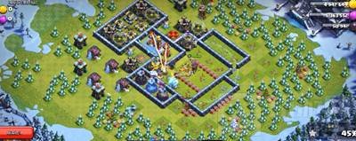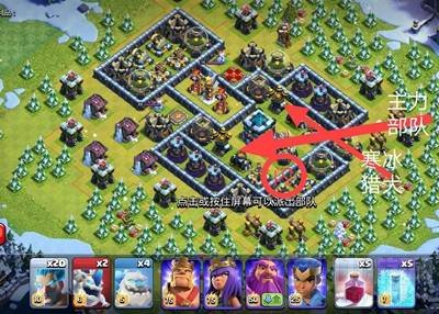 1、首先把圣诞奇袭放在如图所示位置,以便让蛮王开墙进大本营清边和减少地面输出。