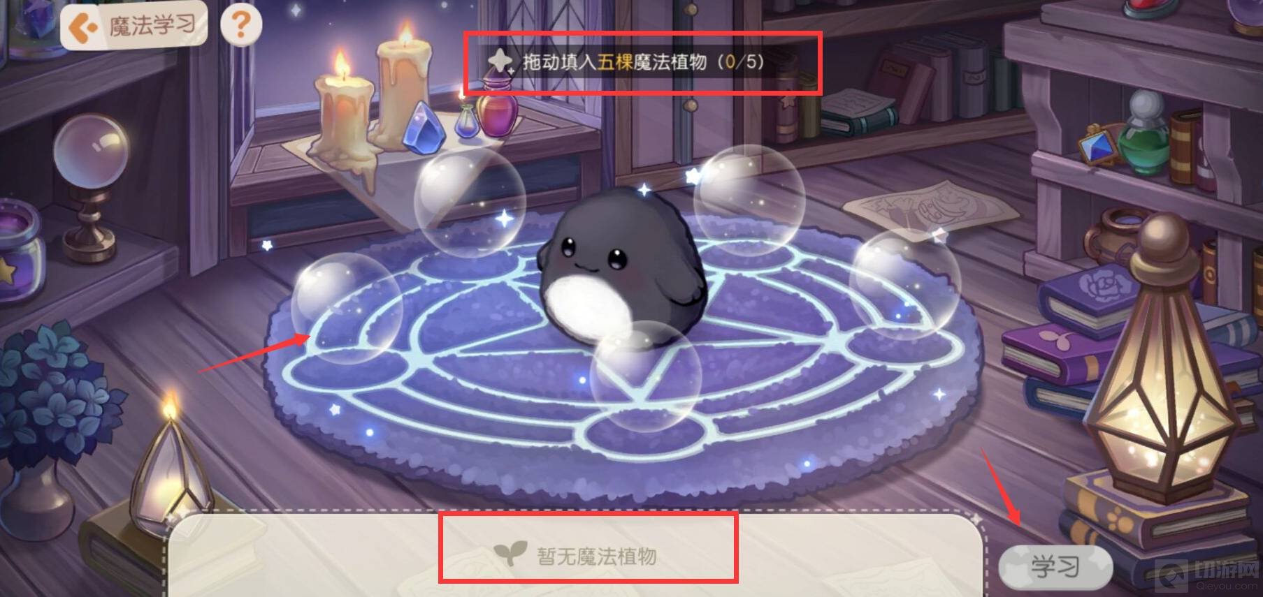 将所拥有的五颗魔法植物拖动到透明泡泡里,点击右下角的学习即可。