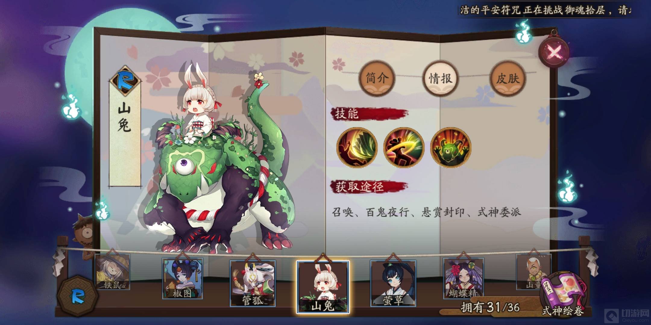清明,带防御罩和增伤技能,防御罩能防御一波伤害,给己方式神缓冲,增伤能增加伤害。
