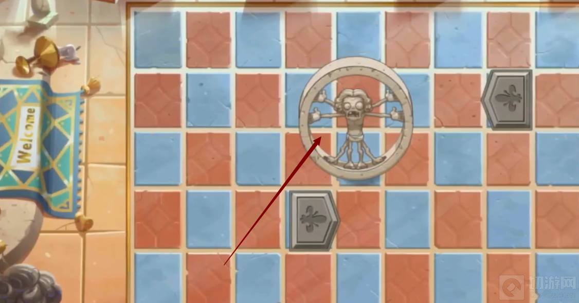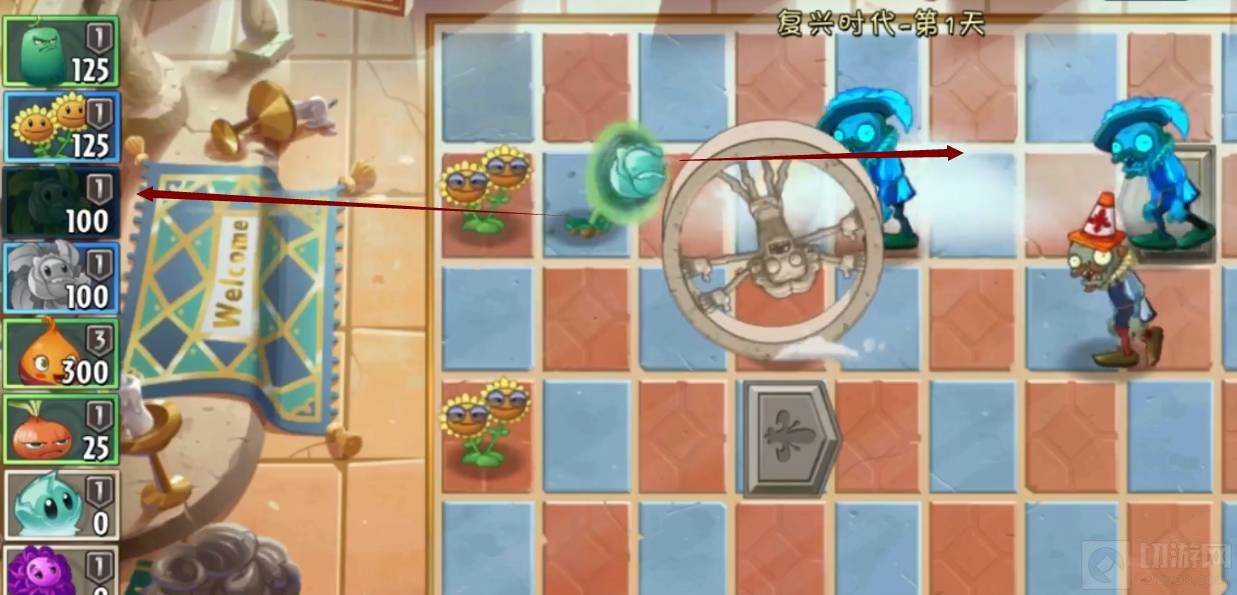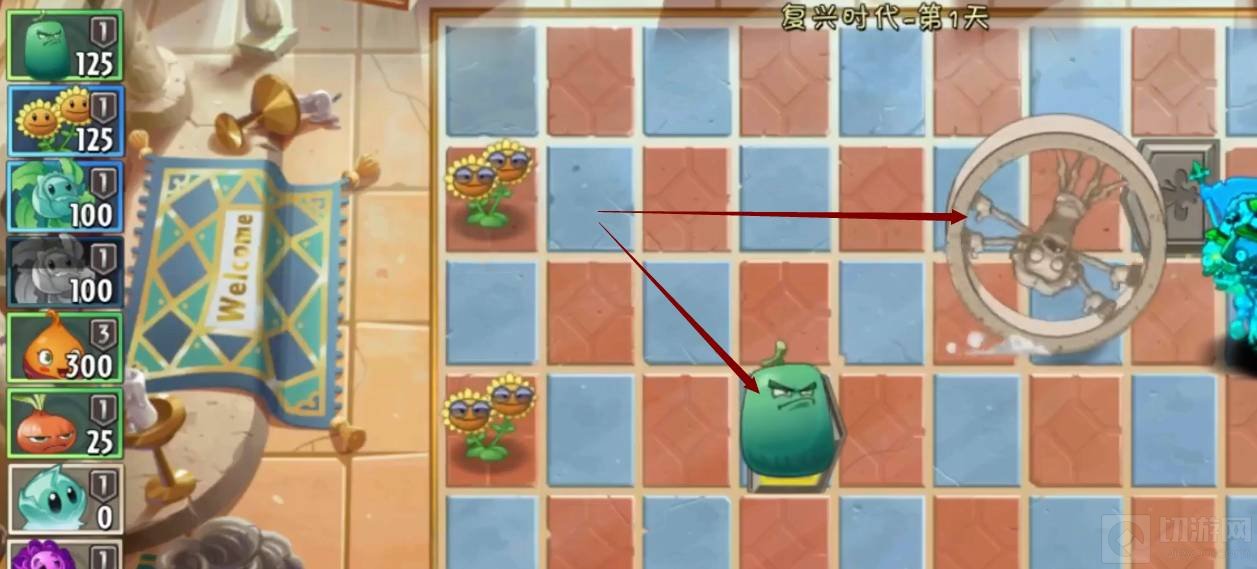 3、这个世界地图关卡,有一个僵尸旋转轮,可以通过种植冬瓜守卫控制旋转轮攻击僵尸。