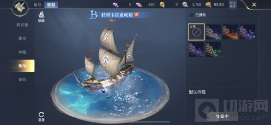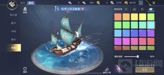 6、至于拖尾可以选择玩套路,比如似水年华,在船尾显露绿色光芒,给人一种不断治疗的错觉。在游戏的对战里,万一敌人不知道这个是拖尾,来对你进行针对,可就上当了。另外还有天谕流星、炼狱之炎等,非常霸气的拖尾可以进行选择。最后来说说舰船染色,可以针对舰船不同的部位进行染色,比如船帆,众多颜色、颜色的浓度都可以由自己选择,可调整性极高。