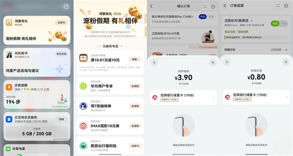 正好十一期间,华为给鸿蒙用户搞了个鸿蒙有礼特别版活动。只要在鸿蒙5的手机桌面右滑进入华为负一屏,找到鸿蒙有礼的服务动态卡片,或直接在负一屏搜索“鸿蒙有礼”就能参与。在10月8日之前,每天都可以领一张10元无门槛元服务优惠券,不管是在奈雪点单元服务买奶茶找快乐,还是在瑞幸咖啡元服务买咖啡提神醒脑,都可以在下单时直接抵扣费用。优惠虽然不是很大,但却胜在实用。