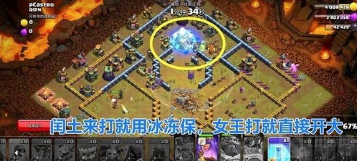 当打下3点钟方向的区域以后,我们在把视角拉到9点钟方向,具体的操作和3点钟区域是一样的,2瓶“骷髅法术”加上1个英雄猎手,如果我方大部队被消灭了,那么就在这个地方补1瓶冰冻法术,把剩下的兵种放在这个区域,例如弓箭手和气球兵来帮助清理这个区域。
