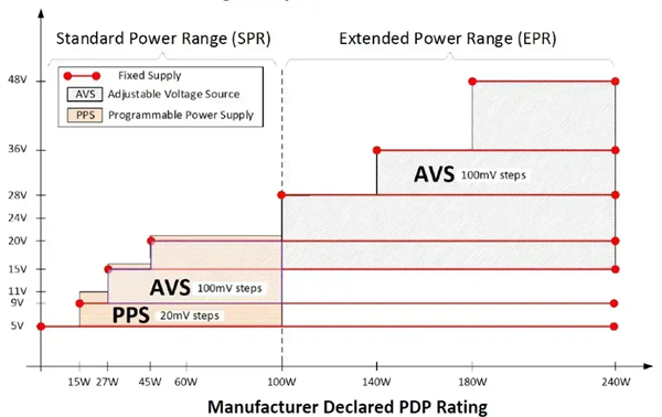 不过在 PD3.1 的时候,这玩意儿主要是用在扩展功率( 15V - 48V )的部分,目的是给像笔记本这类功率偏大的设备充电,所以简称 EPR AVS。