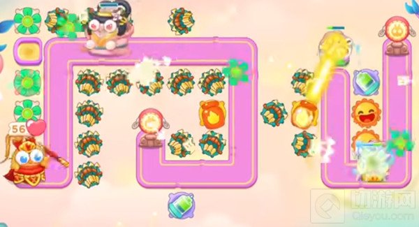 3.打掉之后,在之前酒壶障碍物的位置放一个箭塔,然后锁定下面的大鼎障碍物。把两个靠下的箭塔升到2级。
