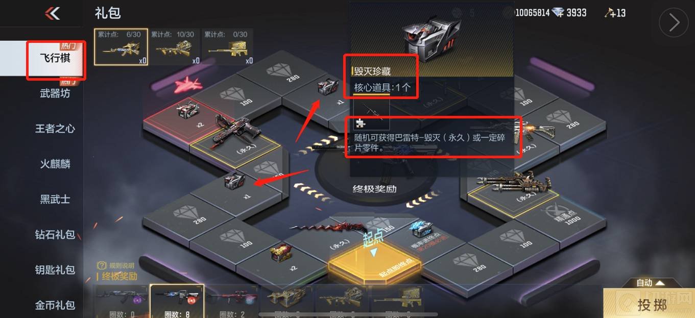 穿越火线手游快速获得巴雷特毁灭,可以用钻石购买骰子在飞行棋中抽取毁灭宝箱获得,每个投子为245钻石一个可以在飞行棋中抽到毁灭宝箱获得,抽到毁灭宝箱的概率是非常高的,所以可以利用钻石购买骰子抽到宝箱开出碎片快速获得。
