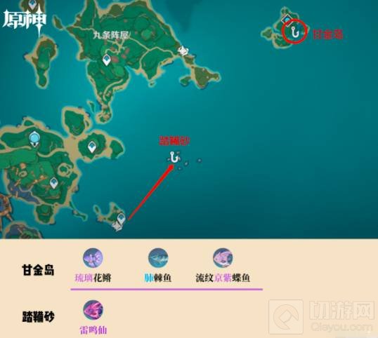 ②甘金岛、踏鞴砂钓点。其中踏鞴砂钓点存在特有鱼类:雷鸣仙