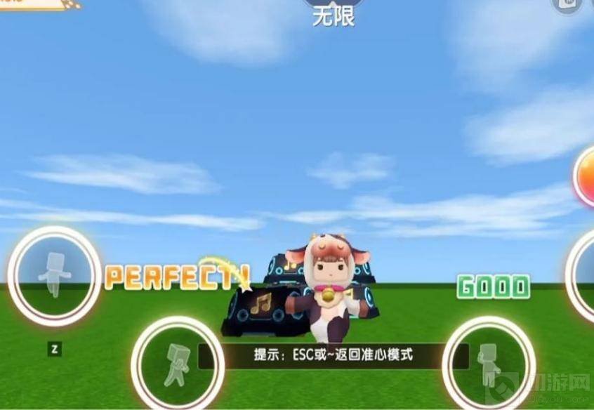 6.稍等片刻,天空就会飘落橙红的小圆球,当小圆球飘落到对应的动作区域时你及时点击,人物就会跳出对应的舞蹈动作了。