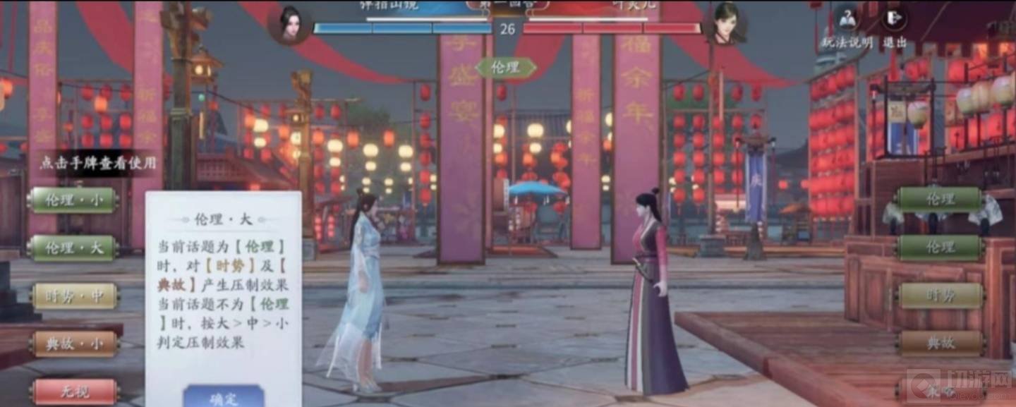 4、舌战的游戏的规则为:开场彼此各得到5张原始牌库,点一下可以查询牌组的实际效果。每一个连击会随即发生一个话题讨论,每连击彼此必须搞出一张牌,和连击话题讨论一致的话题会对此外2种话题讨论造成抑制;相同话题讨论中,抑制关联则为大>中>小。