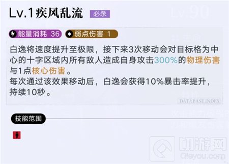 接着是白逸的核心主动技能【疾风乱流】,此技能的效果共有2个:使用技能后,接下来的3次移动都会以移动目标为中心,对十字范围内的敌人造成300%的物理伤害和1点核心伤害每次通过移动后,白逸获得10%暴击率提升,持续10秒此技能在升到10级后的伤害系数将提升到600%,这个伤害系数是对十字格范围所有敌人均可造成的,所以伤害还是非常可观的,但其最终要的还是破核能力,简单说白逸在使用技能后,便可以拥有瞬间击破敌人3点核心的能力(只要敌人的站位不是特别刁钻),配合到白逸的能量积累速度也不慢的特点,靠着【疾风乱流】技能,白逸应该是目前游戏中最强的破核禁闭者。