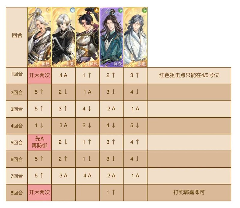 时间:2025-10-08 | 作者: | 阅读:0全程打郭嘉。注意第一回合时,红色狙击圈不能落在前三位身上,只能落在后两位陈登/张邈身上,如果在前三位身上就直接退出重开!!!会导致第八回合被贾诩带走