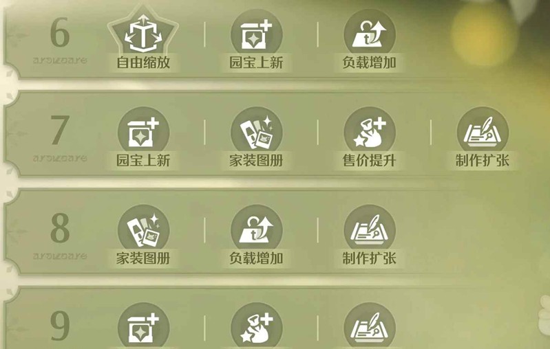 除了5级解锁叮当果树是最大收益点之外(中级田地也能赚钱了),其他等级基本上都是稳步提升,7级9级分别有售价提升,但是考虑到园宝收购每周有上限,以及造家具卖有时候更赚,没必要为了这两个5%来急着升7级。另外9级解锁大型田地种的织云木,进一步提升收益(但是大型田数量不多,提升不大)
