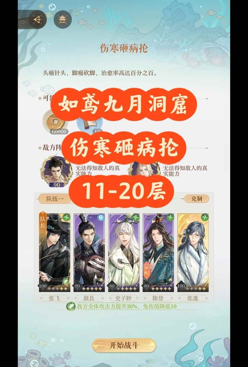 以上是心愿游戏小编为你收集的如鸢九月洞窟怎么打 伤寒砸病抡11-20层攻略,希望有帮到大家,更多相关的文章请关注心愿游戏