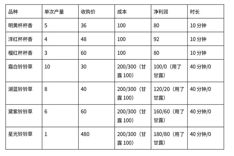 不用减少1小时的甘露加速情况下,杯杯香10分钟一块地净利润是80-92。铃铃草40分钟一块肉的净利润是100-180。
