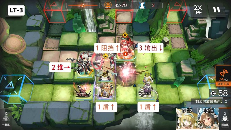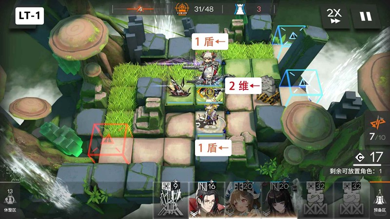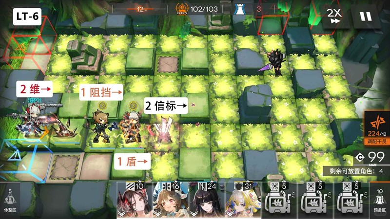 第五关:同样开局先摆2先锋,然后维位置输出往下摆,下面的输出位也可摆上辅助缓解压力,叠完维以后叠奶盾,再加个输出和奶就行,后面的地面位可以上伊内丝或者近卫。