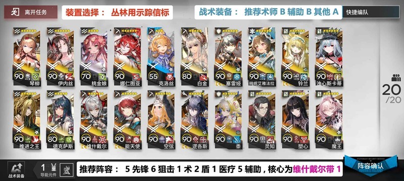 核心:采用维什戴尔单核带1(尽量专3),装置推荐选[丛林用示踪信标],阵容为5先锋6狙击1术士2奶盾1奶5辅助,选干员尽量不拿,可以稍微拿拿先锋狙击或者特种术士做任务。