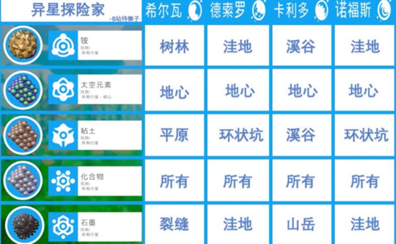 异星探险家中的资源种类繁多,分布在不同星球的各个区域。例如,铵、有机物、化合物、树脂以及太空元素是各星球普遍存在的基础资源,而特定地貌则孕育着独特的矿产。洞穴区域通常产出石英、石墨、粘土与红土,山脉地带则可能富含孔雀石、闪锌矿或钨锰铁矿。不同星球的大气成分也各不相同,如德索罗星球的洞穴中钨锰铁矿储量丰富,而诺夫斯星球的空气中则含有甲烷和氢气。