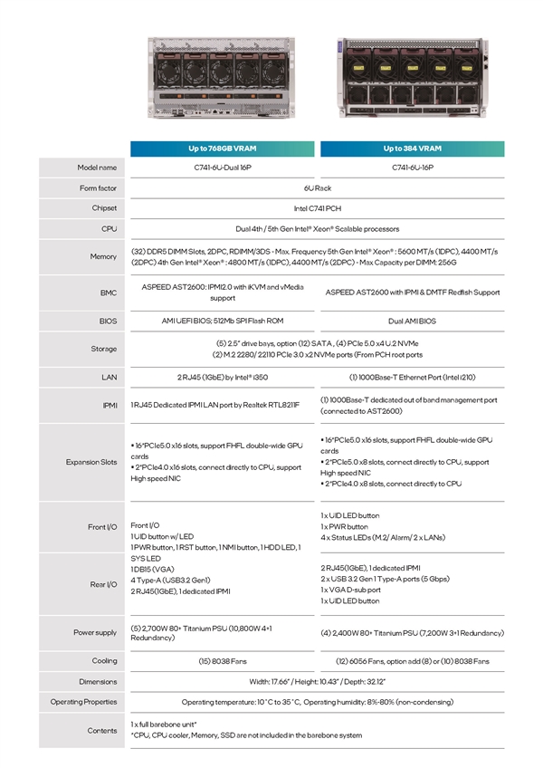 当然也可以选择24GB显存的常规单芯卡,总显存也有384GB,处理器都是四代或五代至强,内存32条插槽。
