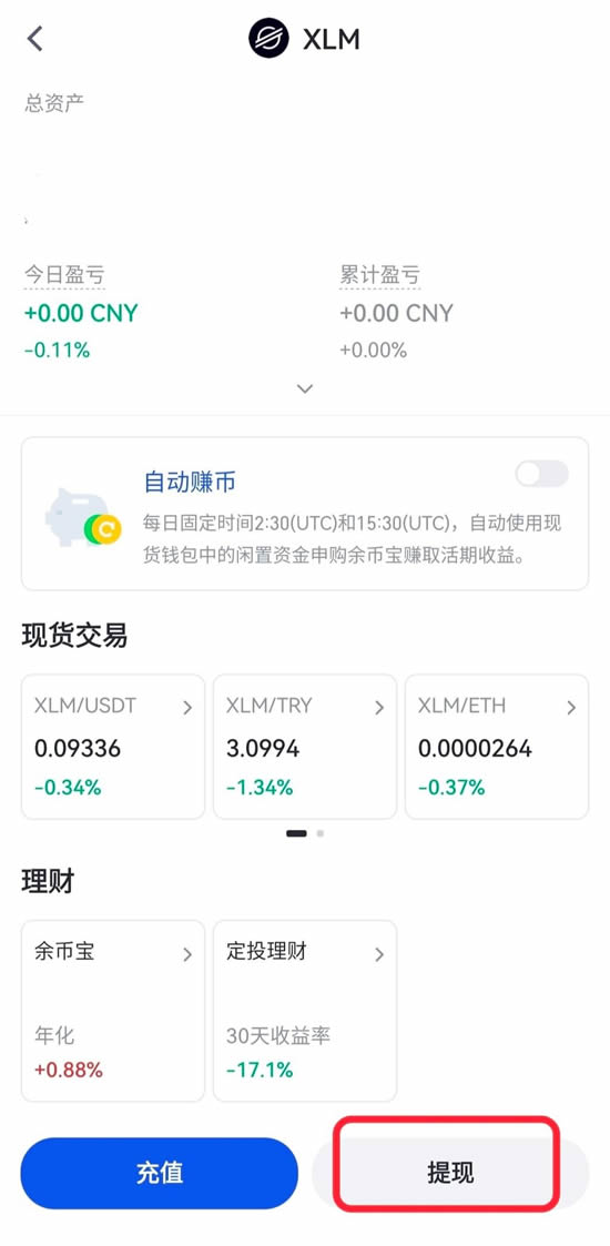 或者可以点击“现货账户”——搜索输入“XLM”——点击进入XLM币种页面——“提现”。