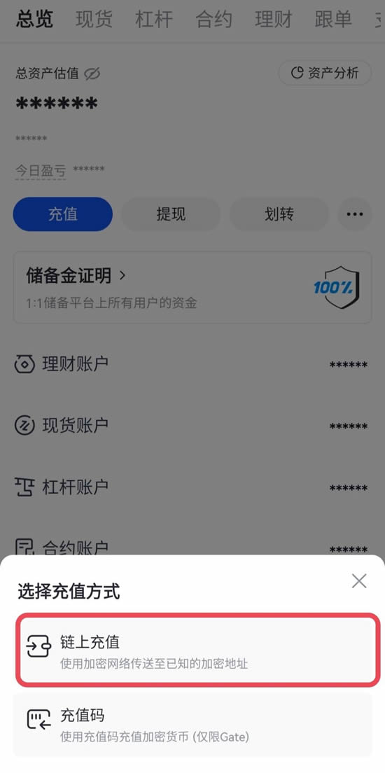 5、打开Gate.io App,登录个人账户,在页面右下角点击“资产”——“充值”。