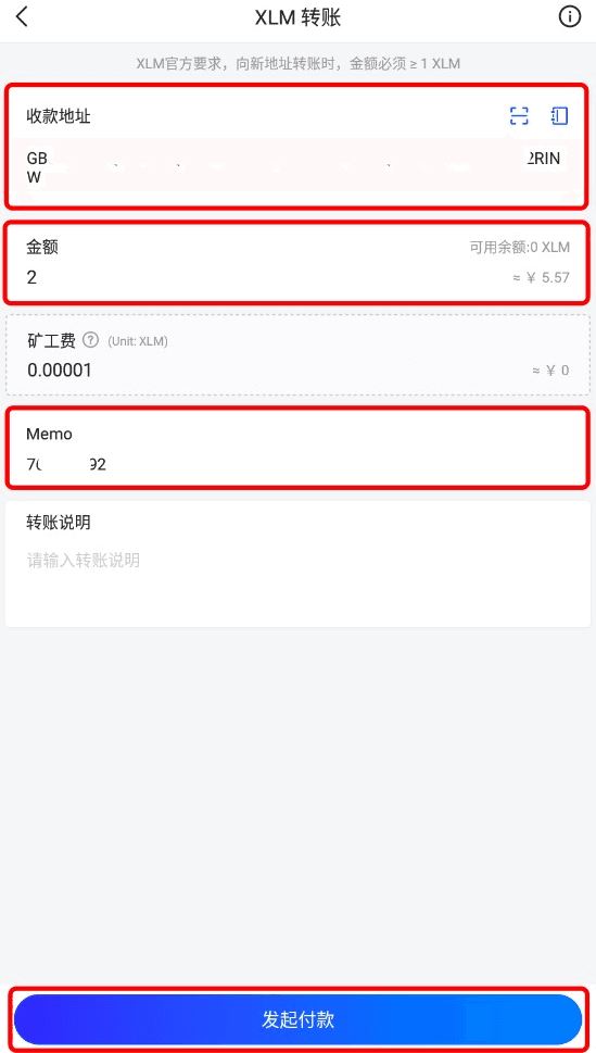 8、复制XLM充值地址和Memo等信息,正确填写在Wallet.io钱包中的转币页面(收款地址、Memo、转账金额),点击“发起付款”。