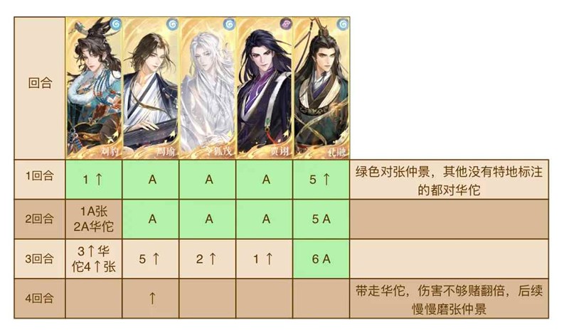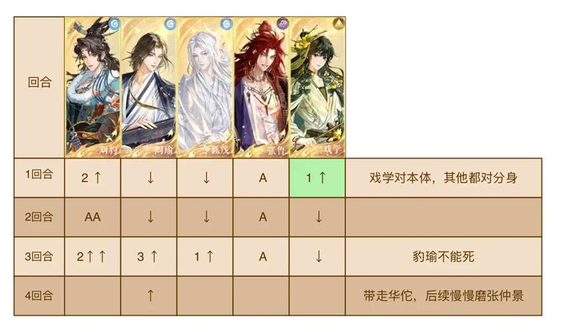 两种核爆思路,保证在华佗身上有8层【侵蚀】前击杀,后续再正常打张仲景,带戏学对练度要求较低,12回合后三位会退场不用管,豹瑜在华佗死亡之前不能死。