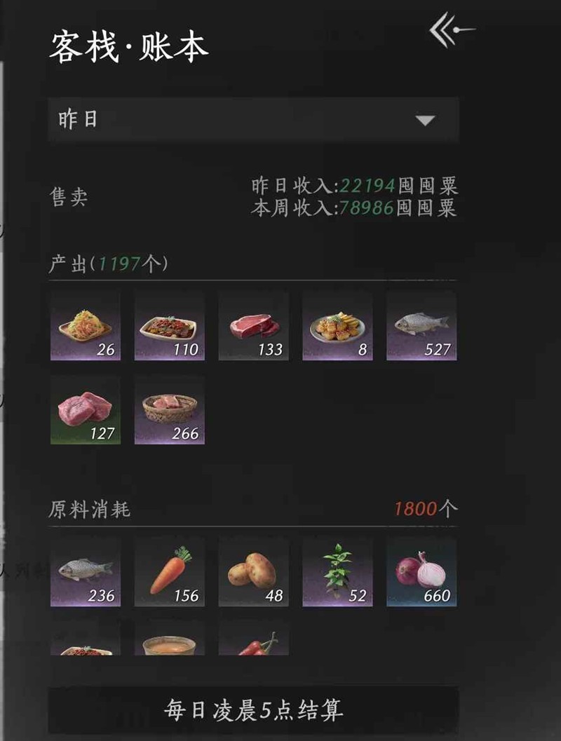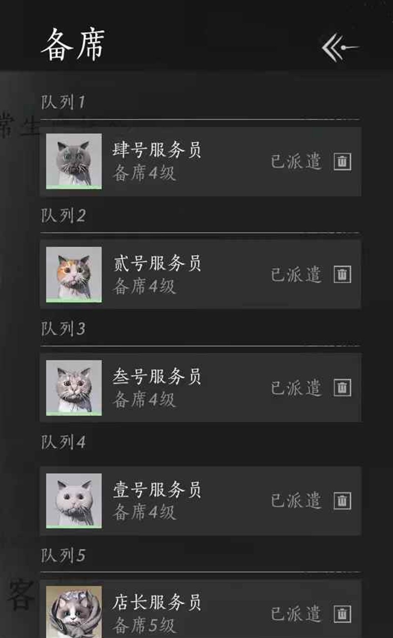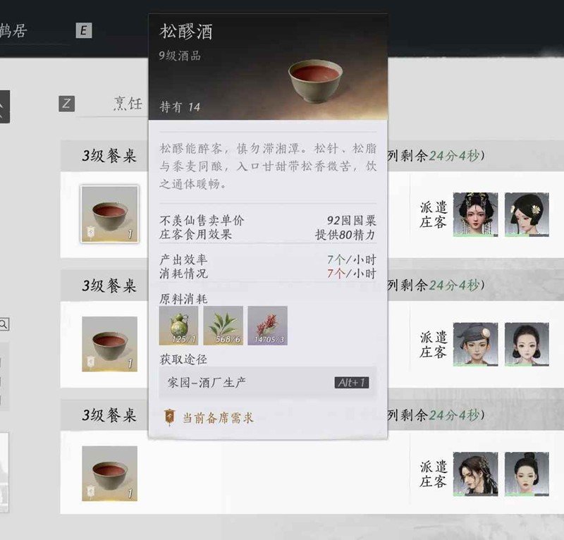 备席:7条松醪酒+1条9级菜,每条2个庄客。一定注意卖酒的庄客A等级+庄客B等级≤4级,建议采用2级+2级,消耗百工簿最少,仅需4本。若备席卖酒庄客总等级超过4级则必须提高对应的酿酒庄客等级,否则有断循环的风险。