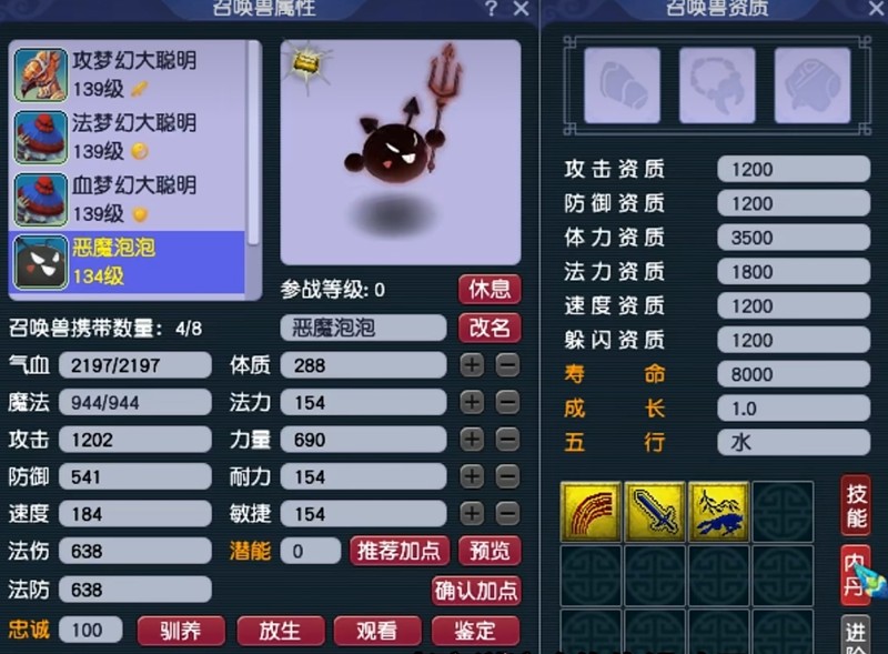活动解锁后,玩家可以直接领取一个恶魔泡泡召唤兽。需要注意的是,通过这种方式获得的恶魔泡泡存在时间限制,只能持续20天。而且初始资质方面,除了体力和法力资质较高外,其他资质都维持在1200左右的水平。