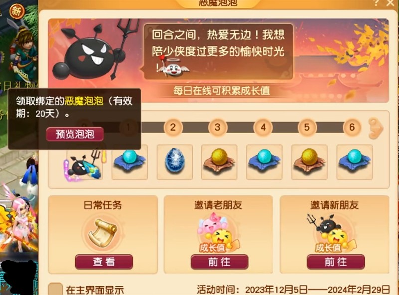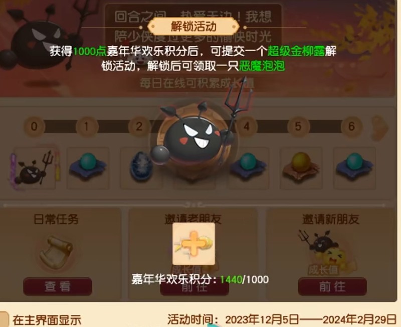 想要获得恶魔泡泡,首先需要参与游戏内的嘉年华活动。通过完成活动中的各项任务指标,累计获得1000点欢乐积分。当积分达到要求后,再提交一个超级金柳露,就能解锁恶魔泡泡的相关活动内容。