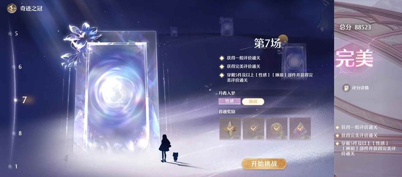 3、第七关三星要求5件及以上【性感】【琳琅】,个人实测最低完美线88523。