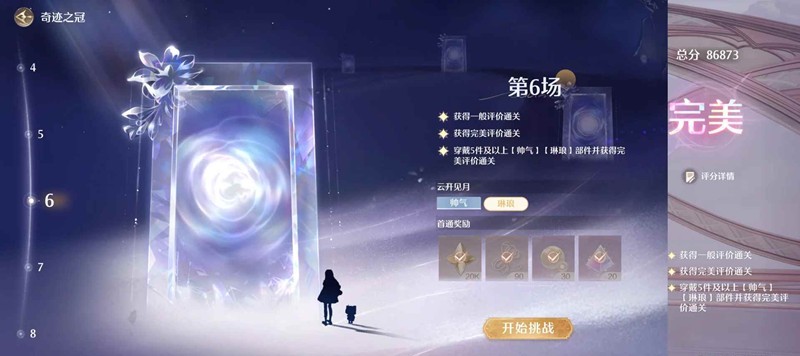 2、第六关三星要求5件及以上【帅气】【琳琅】,个人实测最低完美线86873。